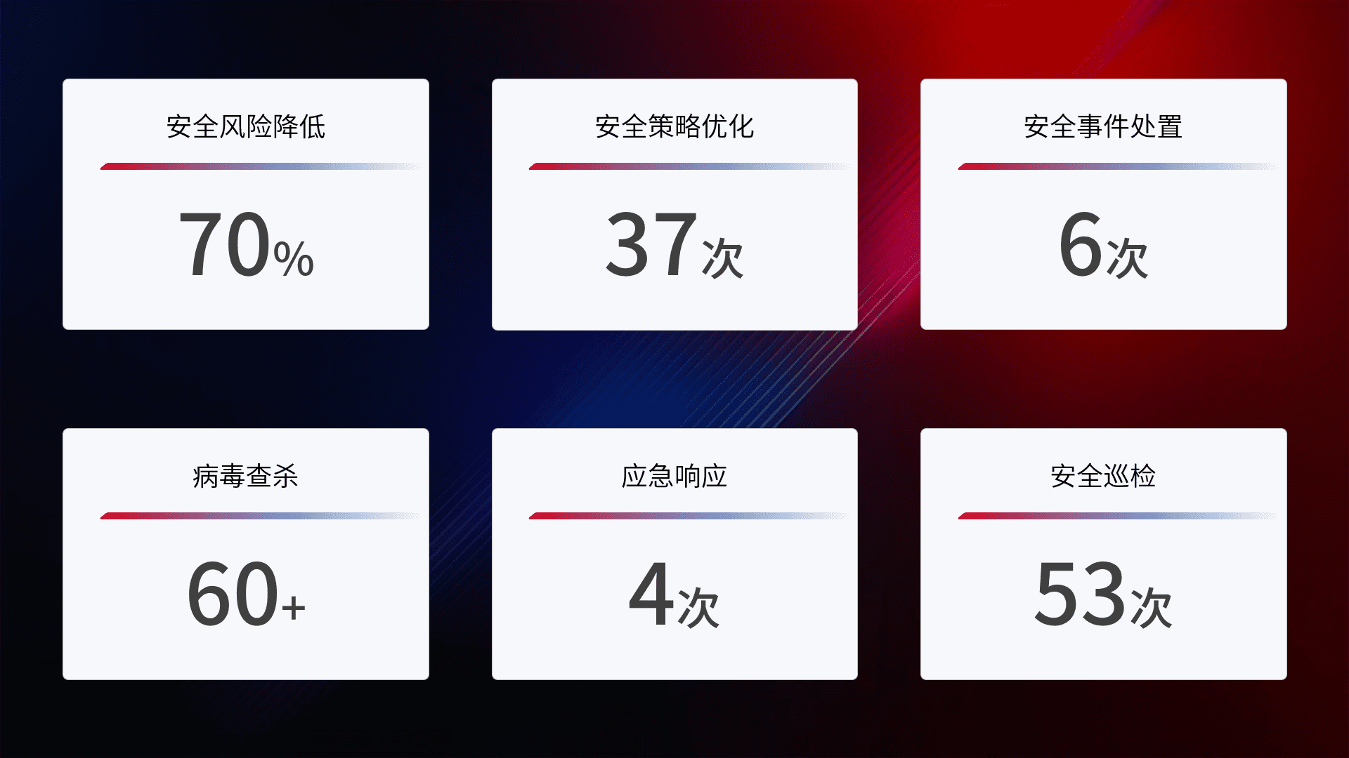 提供全面的安全事件报告体系,,,包括处置报告、、、、周报、、、、季度和年度总结,,结合持续监控,,,帮助客户深入了解网络安全状况。。