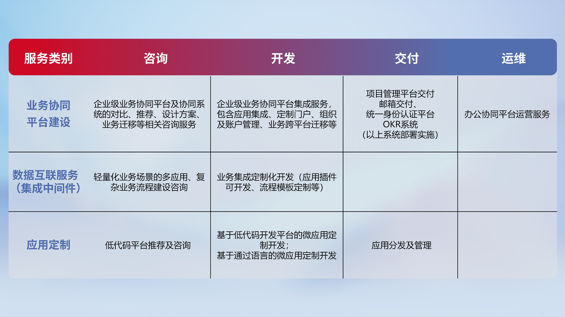 针对钉钉、、、企微、、、、IDaas等平台级产品提供产品的规划、、方案、、、、交付、、、、定制化开发等服务,,,实现如统一协同办公、、、、智能客户服务、、、混合会议管理、、智能数据查询、、、等业务场景,,实现数字化转型。。。。